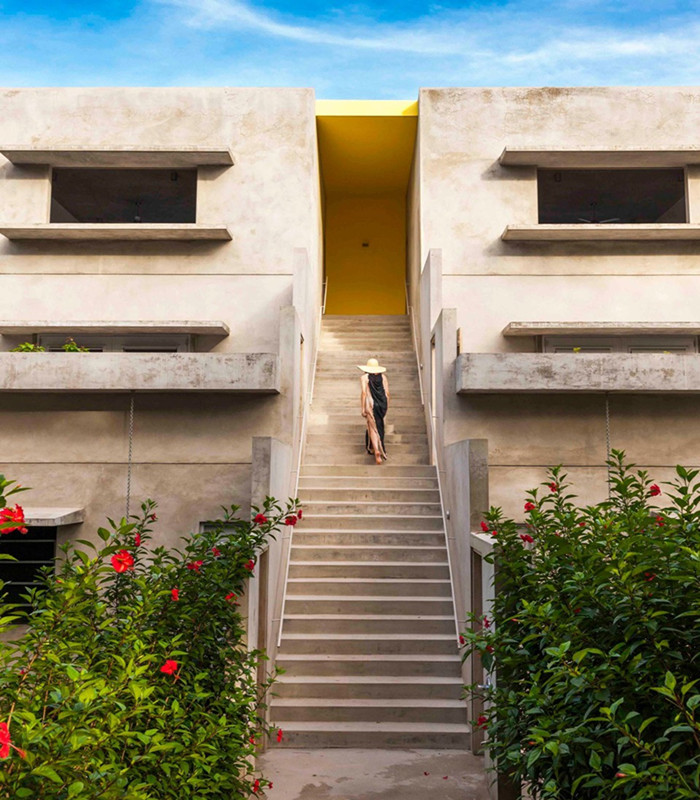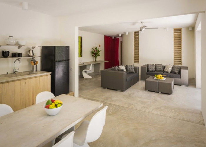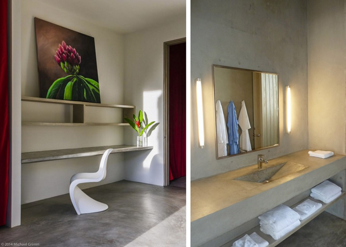 在平面上,建筑朝向有利于加勒比海信風(fēng)聚集并穿堂而過(guò),省去了安裝空調(diào)設(shè)備的需求。房間使用LED照明燈,節(jié)能吊頂風(fēng)扇和其他設(shè)施以減少其總體能耗。光伏面板和電池為酒店提供了電力支持,顧客能為ipad和電腦充電。熱水板可加熱雨水用于露天淋浴,而洗盥污水直接灌溉了花園。